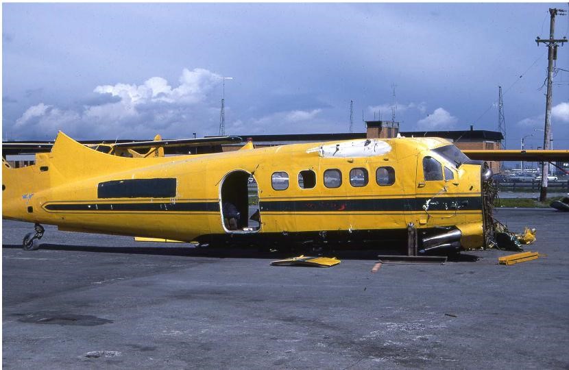 wrinkling the fuselage. Repairs were carried out by DHC at Downsview, after which 3685 was assigned to the Cold Lake Station Flight, Alberta in June 1957, on amphibious floats. As well as serving Cold Lake and the Primrose Lake range (as described in relation to Otter 3683), the Station's Otters on occasion ventured further afield. On 5th February 1958 3685 was at Churchill, Manitoba en route to Station Bird on a mission. At Cold Lake the Otter met with its second mishap on 15th July '58. In the course of a cross-country navigation training flight, en route to a lake some miles from base to practice water landings, the instructor and student were pre-occupied, discussing the aircraft's characteristics and neglected to select the landing gear “up” on the amphibious Otter. They also forgot to check the landing gear prior to landing on the lake. The Otter made a smooth touchdown on the lake but after a short run the nose dropped and the aircraft flipped over onto its back. The crew escaped unharmed after a “rapid emergency evacuation”. The Otter was fished out of the lake and brought to the Lincoln Park Depot, Calgary for repair by Canadian Pacific Airlines. This Depot not only repaired and stored RCAF aircraft but was also responsible for retrieving crashed aircraft. To summarise an article entitled 'The Great Barge' -- “Due to the propensity of the Air Force to land miscellaneous airplanes in various lakes from time to time, our weary Salvage Section requested a portable salvage vessel for retrieving such items. A barge was constructed with a winch, capable of lifting a flooded flying machine or its component parts, transportable in a C-119 or by truck. The barge was ready for action in August 1957, complete with a trusty winch, a sturdy set of gin poles, a diver complete with suit, air pump and signal rope. We couldn't wait for a proper job to turn up, and in July 1958 it did when an Air Force amphib Otter managed to sink in a remote lake”. “The excited Salvage guys loaded the new barge on the designated truck and sped to the scene. There were problems. The diver couldn't see through the silt, floating green stuff turned his stomach and he got hung up halfway down on his safety line and swung about for a while. The Otter was upside down and when hooked flew away like an enraged Marlin on a strike. The loaded cable over the deck sank the front float of the barge under water, curling the barge up like a pretzel and scared the living bejabers out of the salvage crew. Otherwise things went almost fine and as one outboard motor on the barge still reached the water, they hauled their catch over to the shallows, dragged it up the beach and dried it out”. The Otter was then transported back to the Lincoln Park Depot for repair and on completion of the work in March 1959 it returned to 103 Rescue Unit at Greenwood, Nova Scotia. It suffered some unspecified damage on 17th April 1962 and on 24 November 1962 went to 6 Repair Depot, Trenton as a reserve aircraft and was placed in storage, where it remained until issued to 400 Squadron, Downsview in September 1964. Otters based at Downsview were shared between 400 and 411 Squadrons, and 3685 was flying for 411 Squadron when it met its next mishap on 20th June 1965. The 1965 411 Squadron summer camp was held at Fredricton, New Brunswick with a detachment at Harmon AFB, Stephenville, the USAF base on Newfoundland's west coast. The 411 Squadron personnel were housed in tents erected at the Fredericton Airport. During camp, the Otters operated primarily out of Petersville, a 950 foot grass strip at Camp Gagetown. From there the Otters roamed the Gagetown area, alighting at such strips as Bell Ford, Summer Hill, the Manor, Clone's Road, Hayden Road, the Tower and Olinville. 3685 was landing at Olinville when it came to grief on 20th June 1965. During the landing on a training flight, an unexpected gust of wind caused the aircraft to become airborne again. The Otter was not equipped with dual controls and the captain was unable to take over control. The pilot could not stop the aircraft in time and it overshot the runway, descended over a six foot embankment and came to rest 55 feet from the runway. The starboard landing gear compression strut and its attachment had been forced into the fuselage. The accident report noted that no wind sock or other form of wind indicator was available at the strip or in the aircraft. 3685 was taken to the DHC plant at Downsview, repaired and returned to service with 400 Squadron in January 1966. It was still serving with this unit when it was involved in another incident on 3rd May 1968, flying from Downsview with a 411 Squadron crew. As the incident report states: “The pilot was the leader of a three plane formation on a VFR flight plan. The weather briefing stated that conditions at destination would improve to VFR limits by 1400Z, but as the formation proceeded at 3,000 feet an undercast of cloud appeared and obscured the ground more and more and the overcast then became solid. When the formation neared its destination, it was informed that the weather there was - ceiling 600 feet, overcast, visibility 5 to 6 miles in fog. The leader decided to descend through cloud in search of VFR conditions for the balance of the trip. The captain of the number three aircraft declined to follow on the grounds that their position was uncertain and he broke off. The other two Otters descended into cloud but the captain of the number two aircraft then broke formation and climbed back on top. The leader continued his descent, broke out of cloud in poor visibility and struck the top of a tree. Fortunately, the pilot was able to climb back on top and return to base, with pieces of foliage dangling from his Otter”. As the 411 Squadron history recounts of this incident, showing a photograph of the somewhat bent engine cowling of 3685: “View of the cowling after an encounter with a high flying tree. The pilot, J.G.Richard